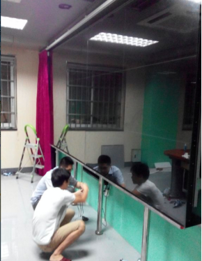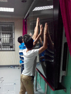 1、把玻璃托住不要讓玻璃下垂(根據客戶現場的不同環境來定制),固定好玻璃之后,在把紅外屏貼(粘)上去(配件里面有紅色雙面膠)。